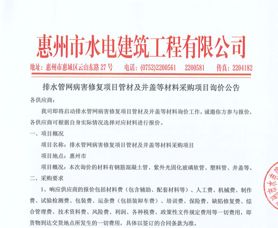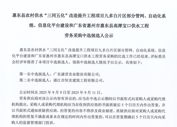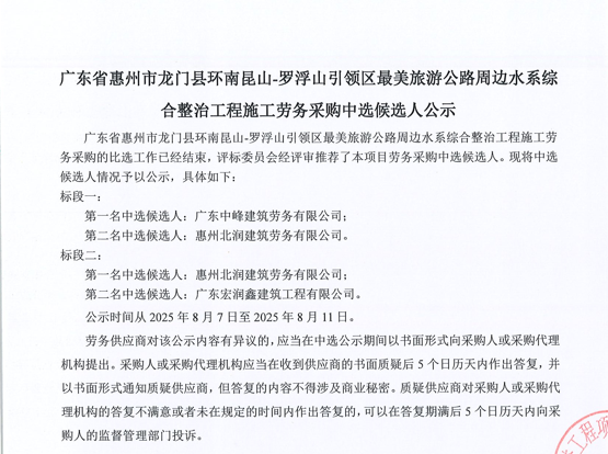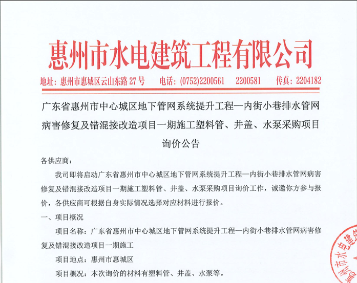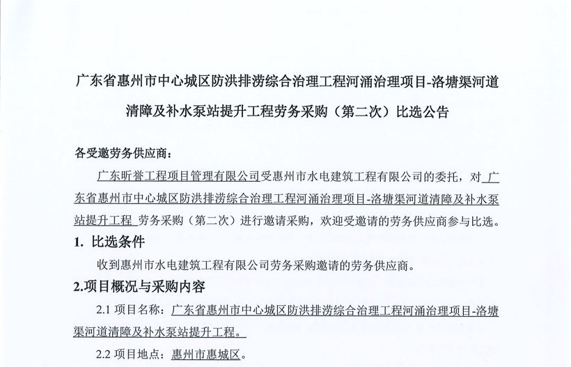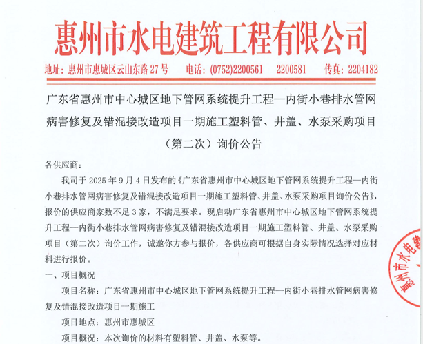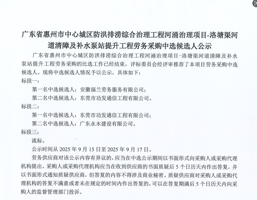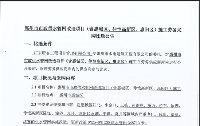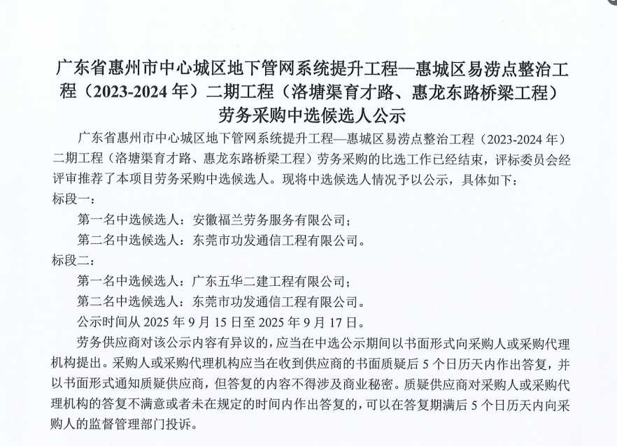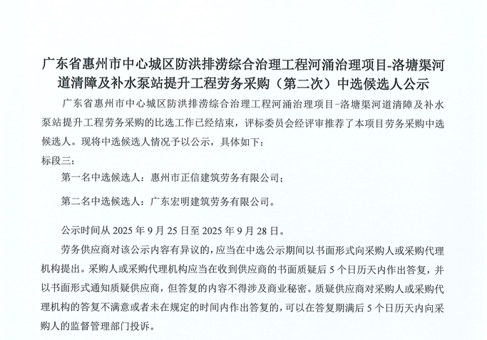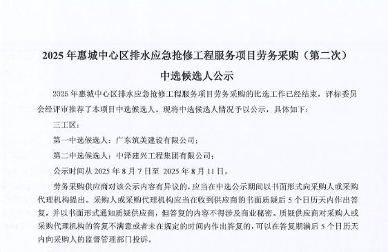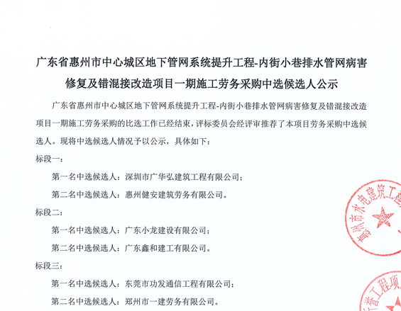廣東省惠州市中心城區(qū)地下管網(wǎng)系統(tǒng)提升工程-內(nèi)街小巷排水管網(wǎng)病害修復及錯混接改造項目一期施工勞務(wù)采購(第二次)中選候選人公示……